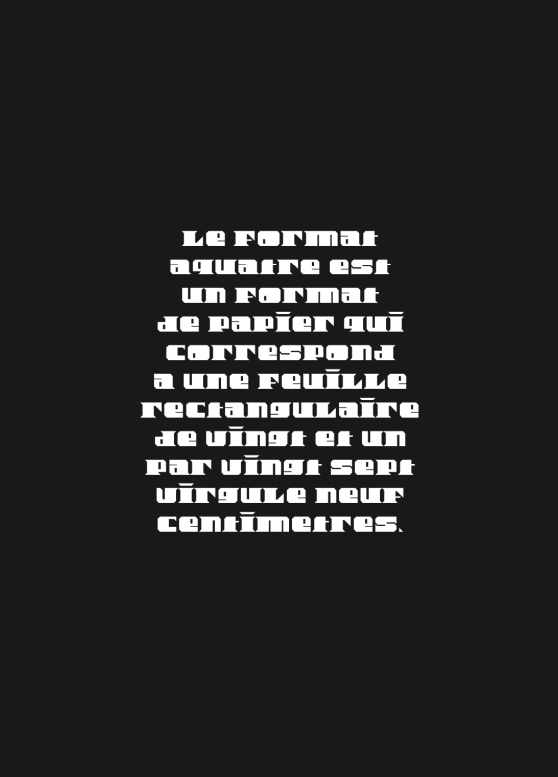 Ce caractère fut dans un premier temps, découpé à partir de feuilles de papier A4. Jouer avec ce format à permis d’aller à l’essentiel en retirant le moins de papier possible et en ne formant aucune courbe. Les lettres en bas de casses, sous la contrainte du format, ont une hauteur commune ascendantes et descentes comprises.